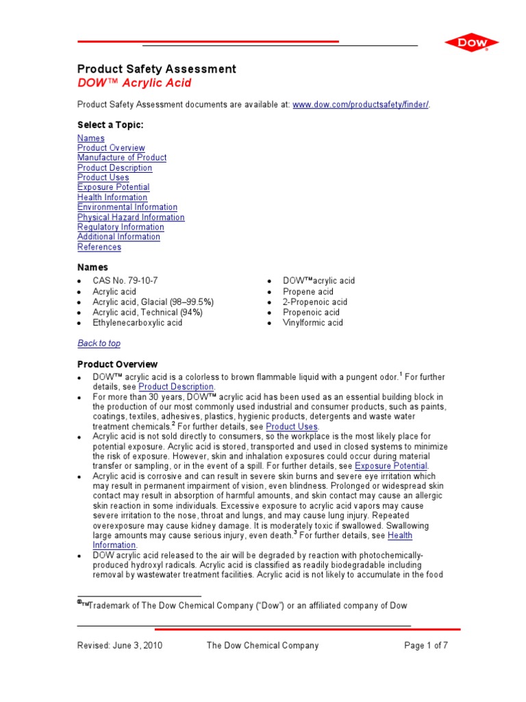 Acrylic acid dow. This colorless liquid has a characteristic acrid or tart smell. July 8 2009 dow to close its ethylene oxide glycol plant in england the dow chemical company announced today that it intends to close its ethylene oxide and glycol eoeg production facility at wilton united kingdom by the end of january 2010. It is miscible with water alcohols ethers and chloroformmore than a million tons are produced annually.